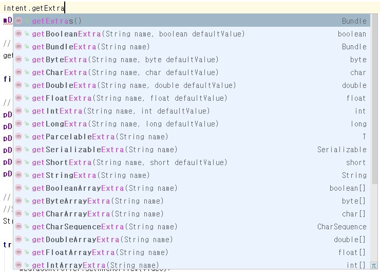 intent.getFloatExtra(), intent.getStringExtra() 등 다양한 메소드를 통하여 원하는 값을 뽑아낸다.