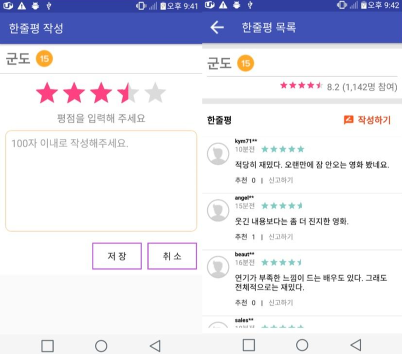 4. '작성하기' Activity에서 작성한 한줄평이 '모두보기' 화면의 한줄평 리스트에
