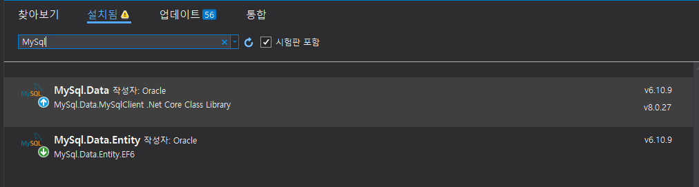 3번에서 설치했던 MySQL Connector Net 버전과 동일한 버전으로 MySql.Data 와 MySql.Data.Entity 패키지를 설치한다.
